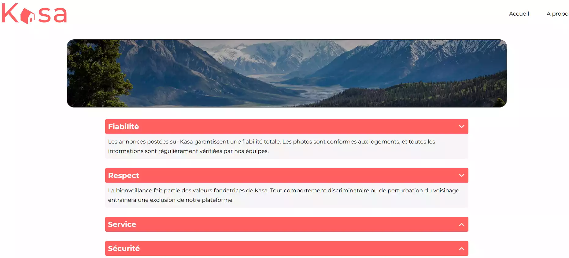 L'entreprise de location immobilière Kasa entamait la refonte de son site internet. En tant que développeur Frontend freelance, j'ai été chargé de recoder le site en utilisant le framework JavaScript React. Le site permet aux utilisateurs de trouver un appartement à louer et de se renseigner sur celui-ci.