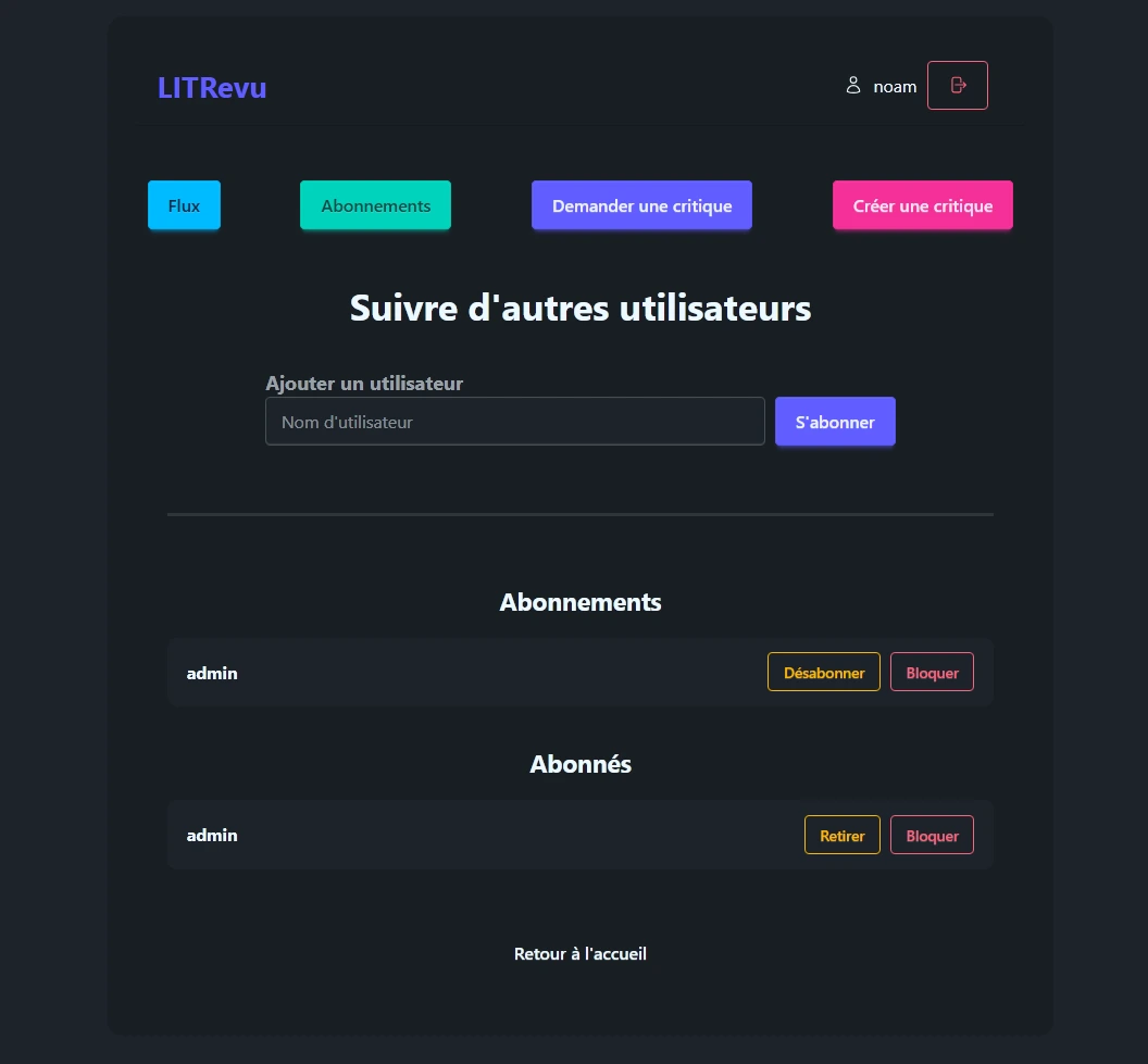 Un système de flux personnalisé affiche les tickets et critiques des personnes suivies, ainsi que ses propres publications. Un espace d'abonnements permet de suivre d'autres utilisateurs par nom d'utilisateur et de consulter ses abonnés.