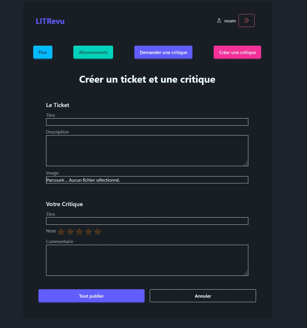 LITRevu est une application web développée avec le framework Django permettant aux utilisateurs de partager des critiques de livres et d'articles. Les utilisateurs peuvent créer des tickets pour demander l'avis de la communauté sur une œuvre, ou rédiger librement une critique complète.